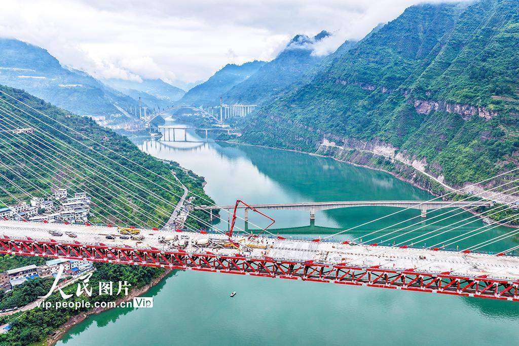新市金沙江特大桥全长1867米,主跨680米,是川内同类型在建最大规模的钢桁梁斜拉桥。新市金沙江特大桥是宜攀高速重要控制性工程,是连接四川与云南两省的重要枢纽,对促进两省经济发展与人文交流意义重大。张元戎摄(人民图片网)