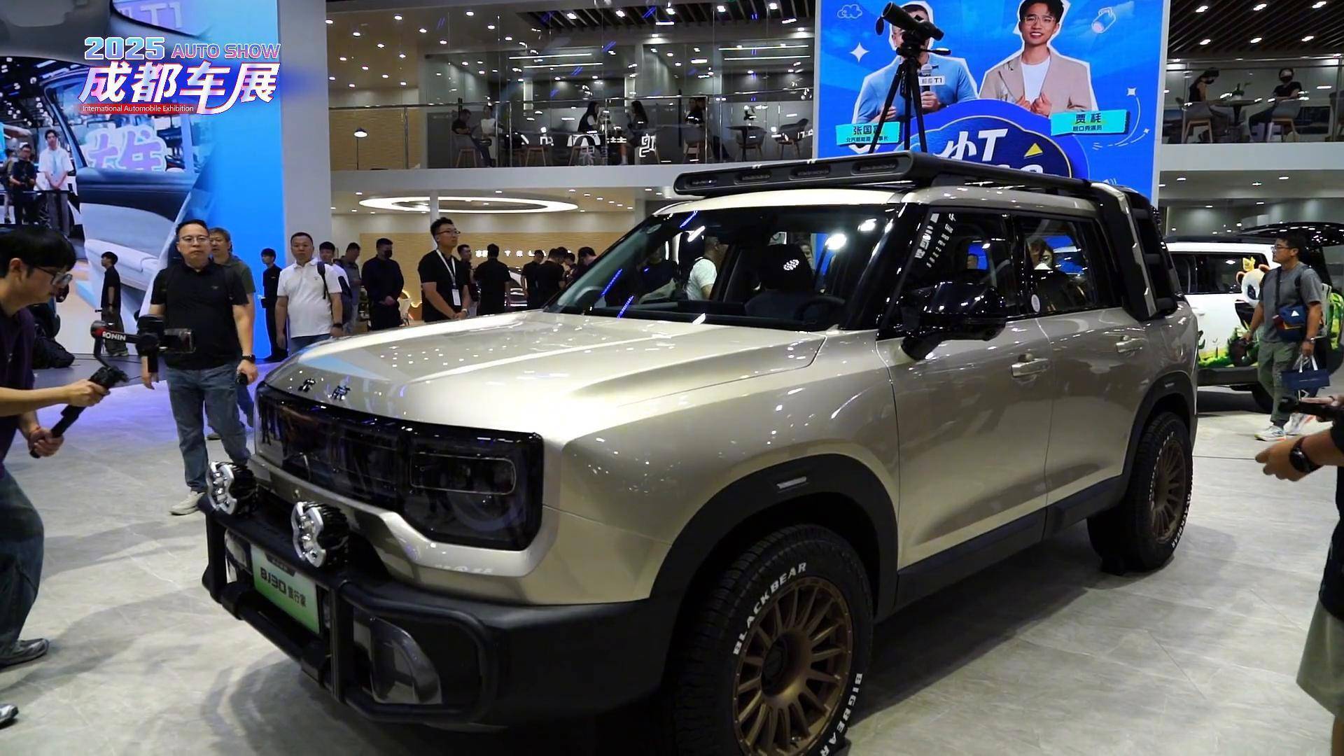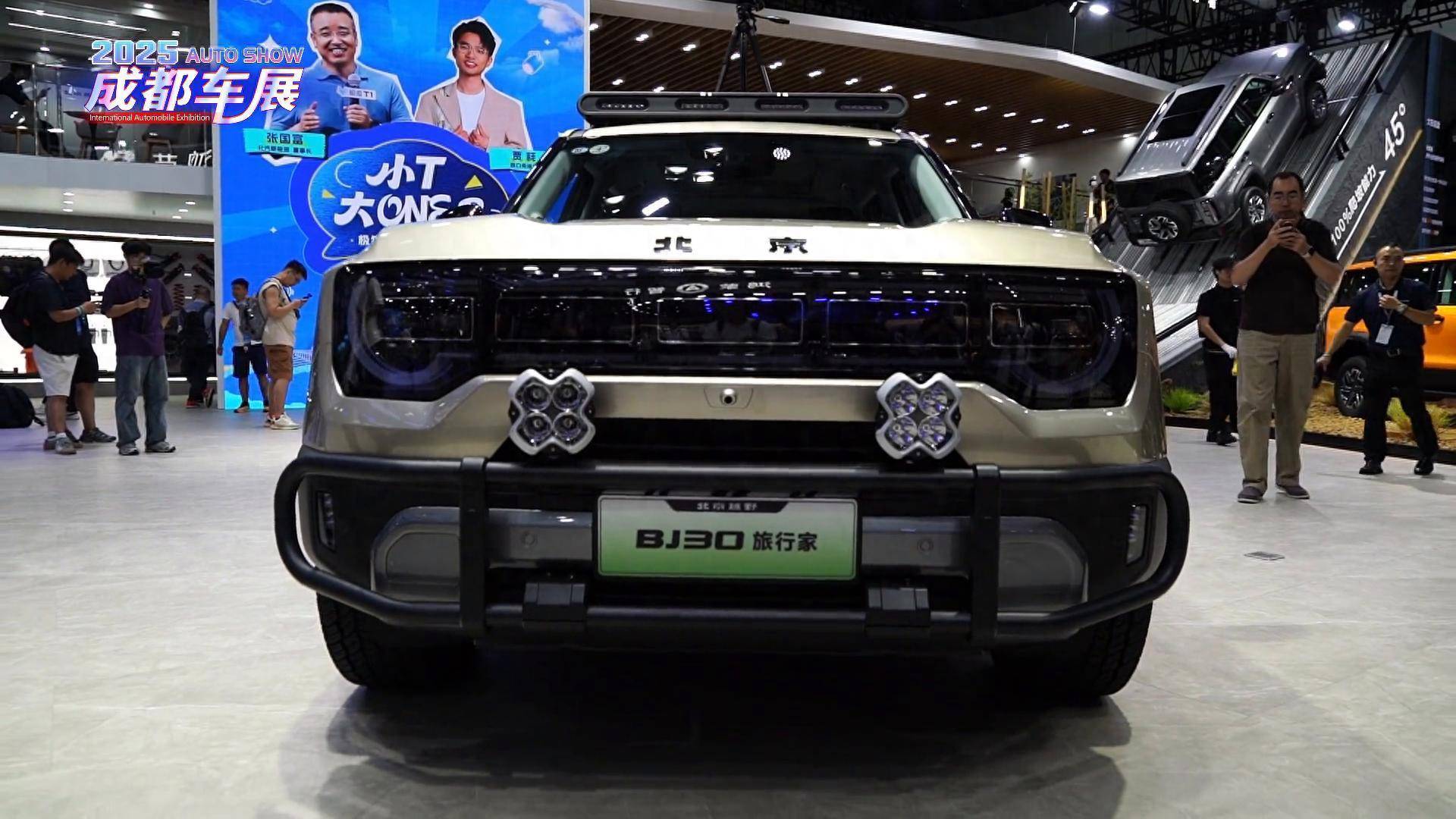 二零二五成都车展现在是在北汽越野的展台,身旁就是这回北汽越野展台的重磅车型BJ30旅行家,目前也是开启了预售,十点二九到十三点九九万元的预售价格。